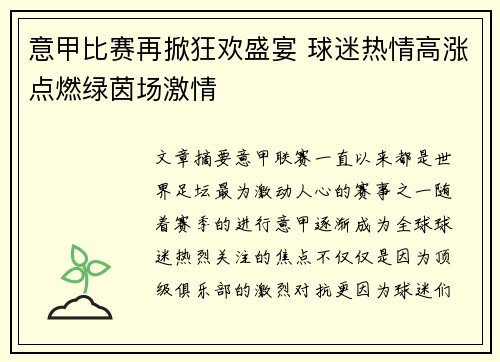 意甲比赛再掀狂欢盛宴 球迷热情高涨点燃绿茵场激情