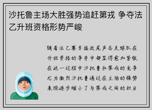 沙托鲁主场大胜强势追赶第戎 争夺法乙升班资格形势严峻