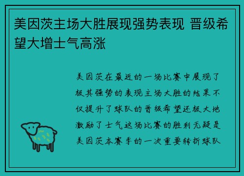美因茨在最近的一场比赛中展现了极其强势的表现,主场大胜的结果不仅提升了球队的晋级希望,还极大地激励了士气。这场比赛的胜利无疑是美因茨本赛季的一次重要转折,球队的表现不仅让球迷欢欣鼓舞,也让对手感受到了...