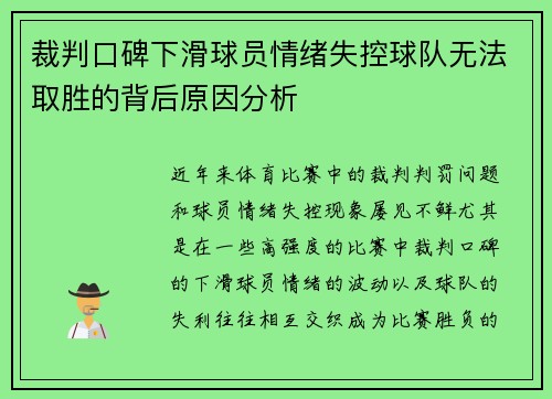 裁判口碑下滑球员情绪失控球队无法取胜的背后原因分析