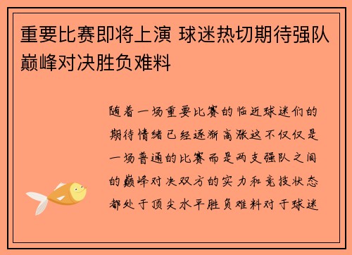 重要比赛即将上演 球迷热切期待强队巅峰对决胜负难料