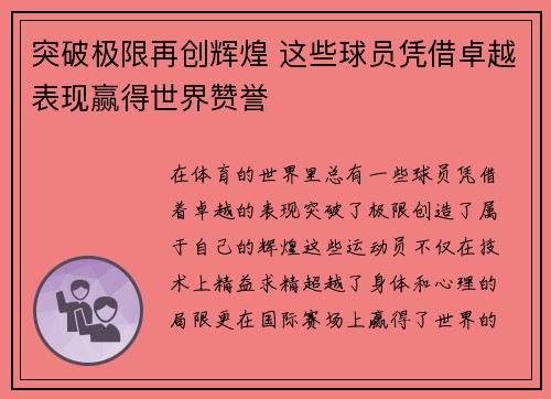 突破极限再创辉煌 这些球员凭借卓越表现赢得世界赞誉