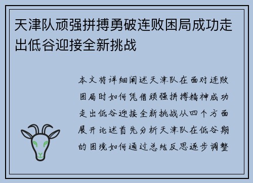 天津队顽强拼搏勇破连败困局成功走出低谷迎接全新挑战