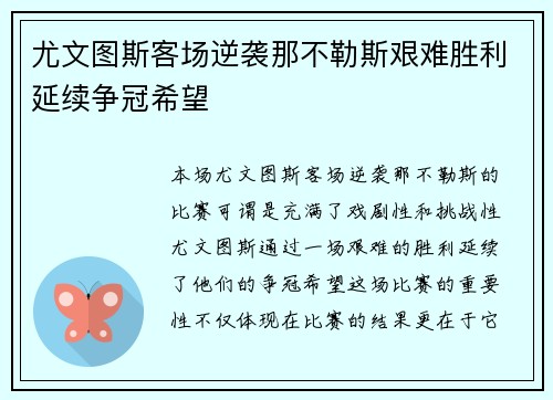 尤文图斯客场逆袭那不勒斯艰难胜利延续争冠希望