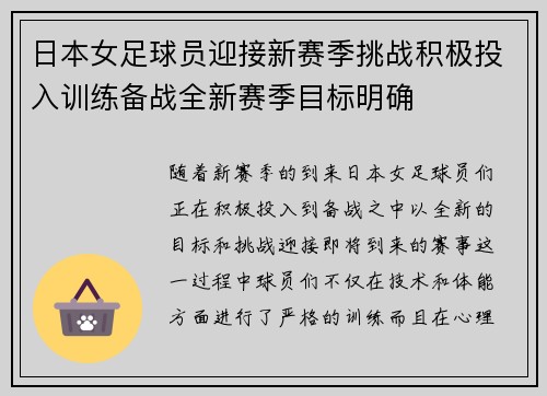 随着新赛季的到来,日本女足球员们正在积极投入到备战之中,以全新的目标和挑战迎接即将到来的赛事。这一过程中,球员们不仅在技术和体能方面进行了严格的训练,而且在心理素质、战术准备和团队协作等多个层面上都做了充分的准备。她们对新赛季的展望非常明确...