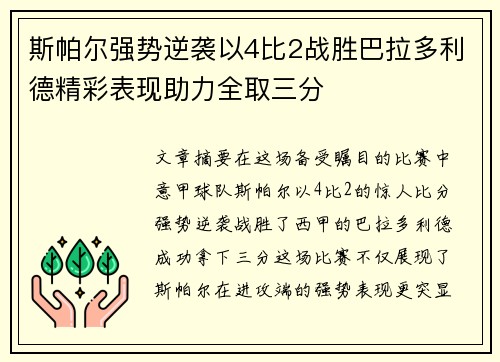 斯帕尔强势逆袭以4比2战胜巴拉多利德精彩表现助力全取三分