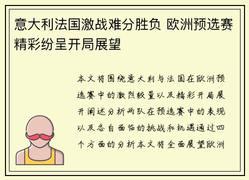 意大利法国激战难分胜负 欧洲预选赛精彩纷呈开局展望