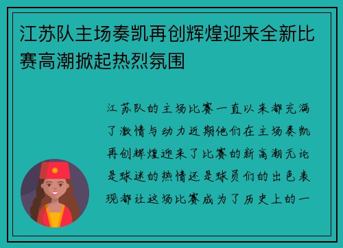 江苏队的主场比赛一直以来都充满了激情与动力,近期,他们在主场奏凯再创辉煌,迎来了比赛的新高潮。无论是球迷的热情,还是球员们的出色表现,都让这场比赛成为了历史上的一大亮点。江苏队不仅仅是在竞技层面展现了强大的实力,更在气氛营造方面做到了无与伦...