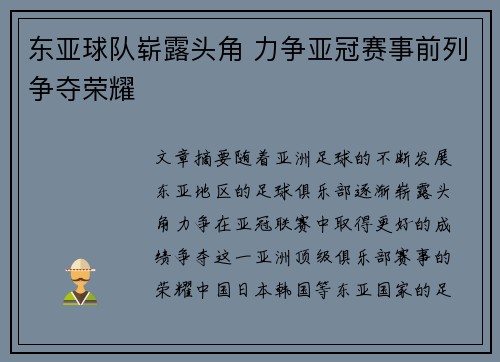 东亚球队崭露头角 力争亚冠赛事前列争夺荣耀