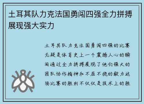 土耳其队力克法国勇闯四强全力拼搏展现强大实力