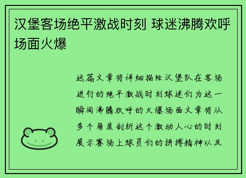 这篇文章将详细描绘汉堡队在客场进行的绝平激战时刻,球迷们为这一瞬间沸腾欢呼的火爆场面。文章将从多个角度剖析这个激动人心的时刻,展示赛场上球员们的拼搏精神以及球迷们的热情支持。首先,将从比赛的激烈程度入手,分析比赛过程中的关键瞬间。接着,将详...