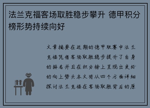 文章摘要:在近期的德甲联赛中,法兰克福凭借客场取胜稳步提升了自身的排名,并且在积分榜上呈现出良好的向上势头。本文将从四个方面详细探讨法兰克福在客场取胜背后的原因、球队的整体表现、战术调整以及未来展望。首先,法兰克福的客场胜利展现了球队强大的...