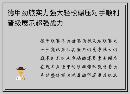德甲劲旅实力强大轻松碾压对手顺利晋级展示超强战力