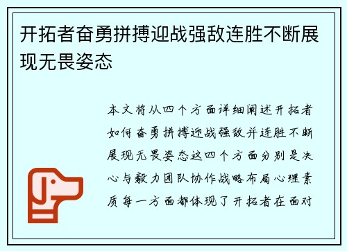 本文将从四个方面详细阐述开拓者如何奋勇拼搏,迎战强敌并连胜不断,展现无畏姿态。这四个方面分别是:决心与毅力、团队协作、战略布局、心理素质。每一方面都体现了开拓者在面对挑战时所展现的非凡风采与坚韧精神。在这些方面的支持下,开拓者们不仅能够在困...