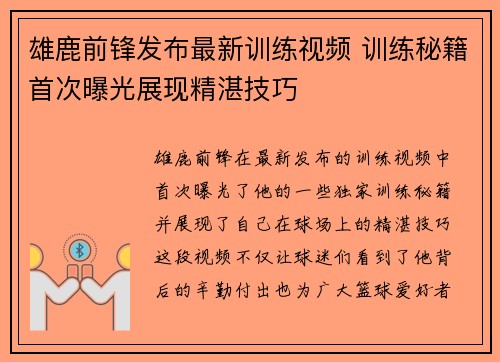 雄鹿前锋发布最新训练视频 训练秘籍首次曝光展现精湛技巧