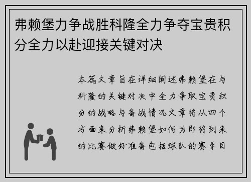 本篇文章旨在详细阐述弗赖堡在与科隆的关键对决中,全力争取宝贵积分的战略与备战情况。文章将从四个方面来分析弗赖堡如何为即将到来的比赛做好准备,包括:球队的赛季目标与当前状态、对科隆的战术准备与策略、球员个人的表现与关键因素,以及教练组的决策与...