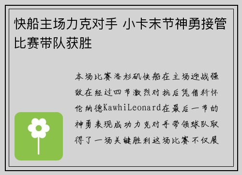 本场比赛,洛杉矶快船在主场迎战强敌,在经过四节激烈对抗后,凭借科怀·伦纳德(Kawhi Leonard)在最后一节的神勇表现,成功力克对手,带领球队取得了一场关键胜利。这场比赛不仅展现了快船整体的出色团队配合,也证明了小卡在关键时刻的决定性...