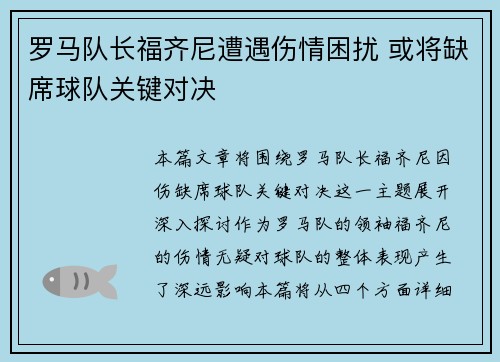 本篇文章将围绕罗马队长福齐尼因伤缺席球队关键对决这一主题展开深入探讨。作为罗马队的领袖,福齐尼的伤情无疑对球队的整体表现产生了深远影响。本篇将从四个方面详细分析福齐尼的伤情困扰,及其可能对罗马队带来的潜在影响。首先,文章将介绍福齐尼的伤情以...