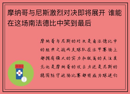 摩纳哥与尼斯激烈对决即将展开 谁能在这场南法德比中笑到最后