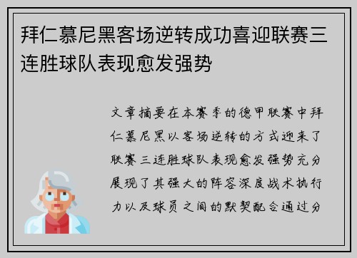 拜仁慕尼黑客场逆转成功喜迎联赛三连胜球队表现愈发强势