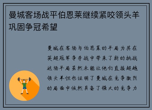 曼城客场战平伯恩莱继续紧咬领头羊巩固争冠希望