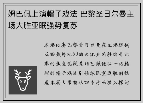 本场比赛,巴黎圣日尔曼在主场迎战亚眠,最终以5-0的大比分完胜对手。比赛的焦点无疑是姆巴佩,他以一记精彩的帽子戏法引领球队重返胜利轨道。本篇文章将从四个方面深入探讨姆巴佩在比赛中的表现,以及巴黎圣日尔曼的强势复苏。首先,将分析姆巴佩如何凭借...