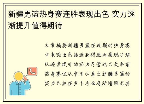 文章摘要:新疆男篮在近期的热身赛中表现出色,接连获得胜利,展现了球队逐步提升的实力。尽管这只是季前热身赛,但从中可以看出,新疆男篮的实力已经在多个方面有所增强,尤其是在进攻、防守、团队配合和新援融入等方面,都取得了显著的进展。通过对新疆男篮...