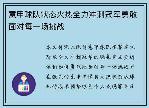 意甲球队状态火热全力冲刺冠军勇敢面对每一场挑战