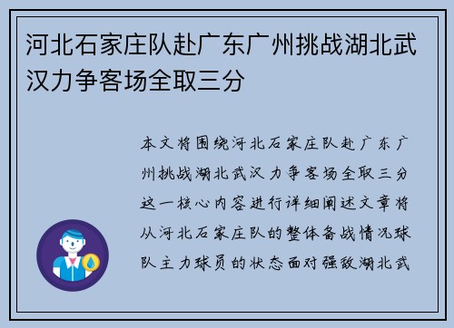 本文将围绕河北石家庄队赴广东广州挑战湖北武汉,力争客场全取三分这一核心内容进行详细阐述。文章将从河北石家庄队的整体备战情况、球队主力球员的状态、面对强敌湖北武汉的战术安排以及客场作战的心理压力等四个方面展开分析。首先,我们将深入探讨河北石家...