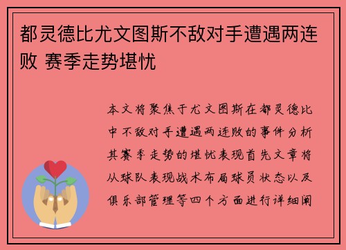 本文将聚焦于尤文图斯在都灵德比中不敌对手,遭遇两连败的事件,分析其赛季走势的堪忧表现。首先,文章将从球队表现、战术布局、球员状态以及俱乐部管理等四个方面进行详细阐述。尤文图斯在本赛季中的表现令人担忧,尤其是在都灵德比中,面对老对手都灵,未能...